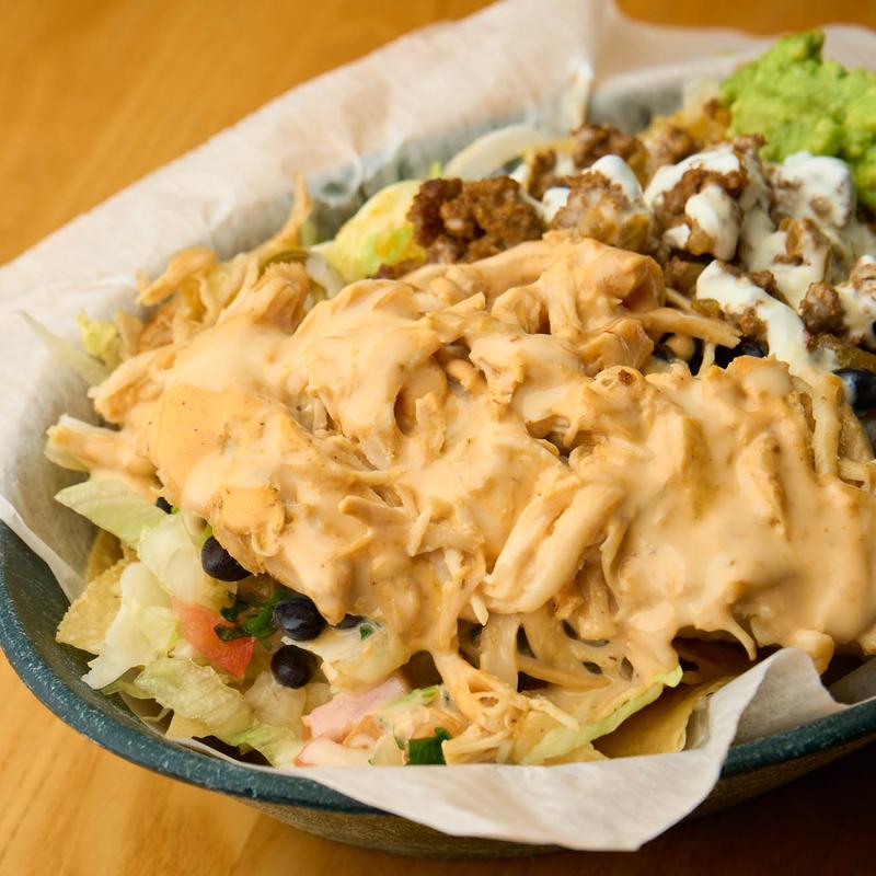 Grilled chicken, onions, peppers, pimento cheese, crunchy corn layer. Topped with Estrella sauce.