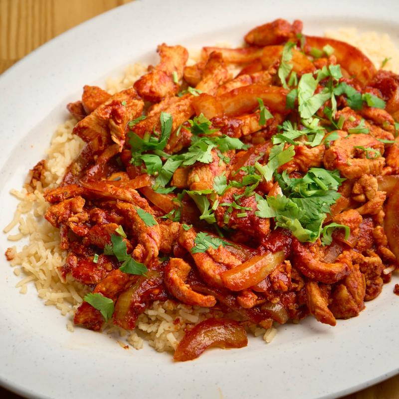 Chicken marinated in Tandoori spices, with sautéed onions and peppers, cilantro, and mango salsa.